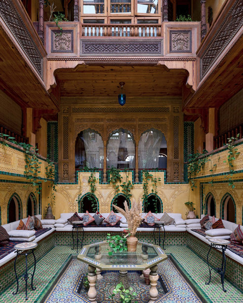 Elements common within the interior include; stained glass, arches, ceramics, intricately carved wood and stone details, Arabic calligraphy and Moroccan-style lamps.